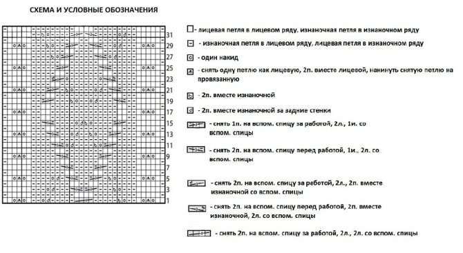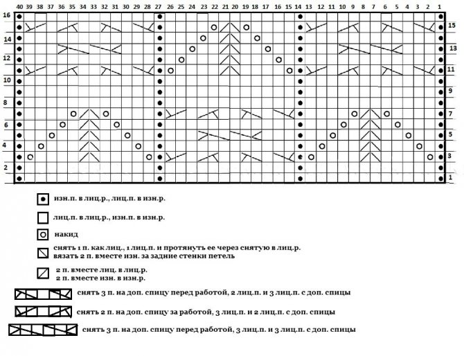 - основной узор: 1р. (лиц. стор.): 4л., *3и., 3л.*- от * и до * дублировать до 1п., 1л.; 2р.: 1л., *3и., 3л.* – от * и до * дублировать до крайних 4п., 3и., 1л.; 3р.: как 1р.; 4р.: как 2р.; 5р.: 1л., *1н., 1п. снимаем, 2п. в 1л., набросить снятую п. на провязанную, 1н., 3л.*- от * и до * дублировать до крайних 4п., 1н., снять 1п., 2п. в 1л., набросить снятую п. на провязанную, 1н., 1л.; 6р.: 1л., *3л., 3и.* – от * и до * дублировать до крайних 4п., 4л.; 7р.: 1л., *3и., 3л.* – от * и до * дублировать до крайних 4п., 3и., 1л.; 8р.: как 6р.; 9р.: как 7р.; 10р.: как 6р.; 11р.: 4л., *1н., 1п. снять, 2п. в 1л., набросить снятую п. на провязанную, 1н., 3л.* – от * и до * дублировать до крайних п., 1л.; 12р.: как 2р.