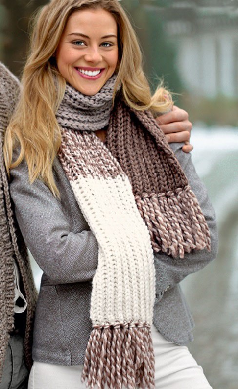 Сегодня очень модным является шарф из толстой пряжи. Он вяжется быстро, а смотрится эффектно. Нужно лишь учитывать особенности при работе с толстой нитью. Такой шарф согреет в холодную погоду, и дополнит образ. Для начинающих рукодельниц подойдет модель, связанная резинкой и украшенная бахромой. Подберите меланжевую нить, и вариант шарфа получится броским и нарядным.