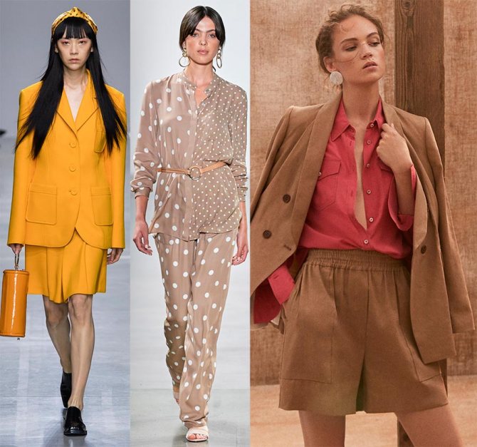 Как видите, в этом сезоне многие дизайнеры переосмыслили назначение костюма и представили его совсем не в деловом настроении. На подиуме можно было увидеть смелые идеи и нестандартные решения – с мини-юбками и мини-шортами, с бра-топами вместо блузок и высокими разрезами на юбках, костюм на голое тело, с яркой палитрой и озорным принтом.