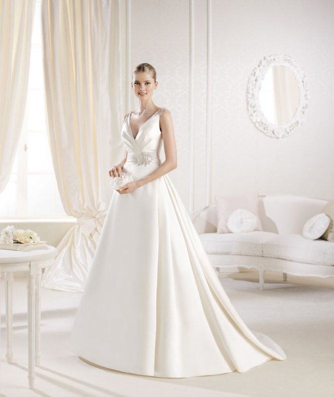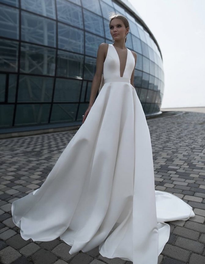 Идеальный вариант для девушек, желающих почувствовать себя принцессами. Свадебные платья с пышной атласной юбкой выглядят максимально торжественно и прекрасно подходят для торжества. Однако невесте стоит предварительно потренироваться носить на себе такую конструкцию и передвигаться в подобном наряде.