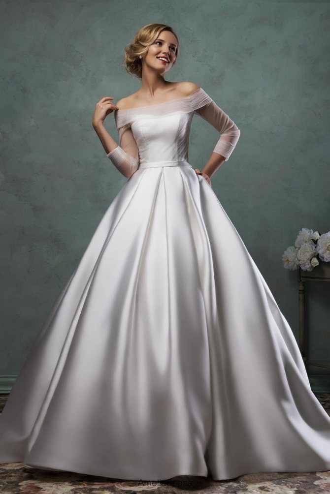 Атласное свадебное платье с рукавами позволяет сгладить объемность пышных юбок. Как правило, используются кружевные рукава. При этом применяется атласный низ, а часто и лиф из этой же ткани.