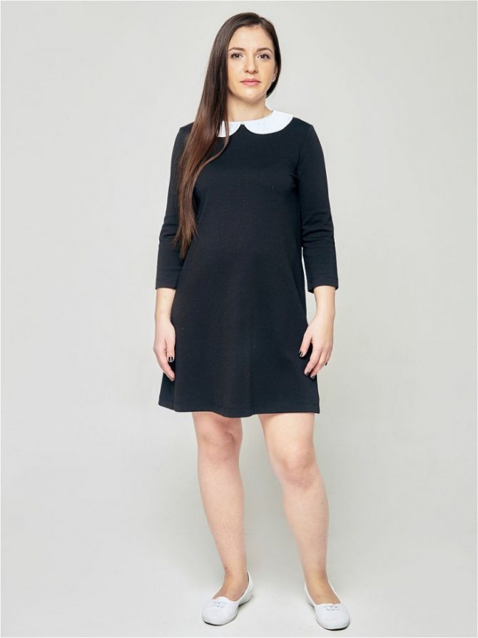 Отделка с помощью белого воротничка представляет известный всем школьный фасон. Для него характерен простой крой и юбка, расклешенная или в складку. Элегантная модель остается актуальной и сегодня.