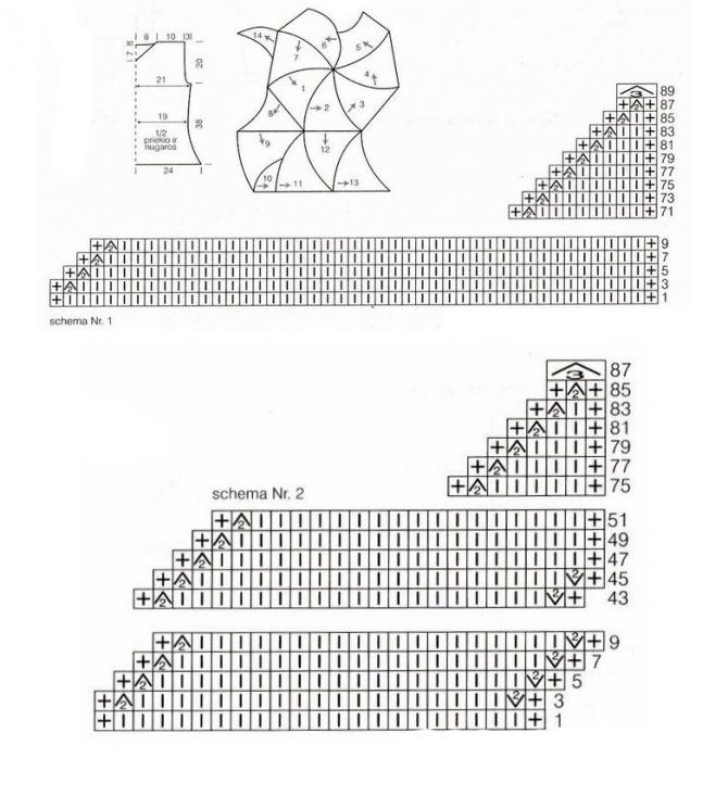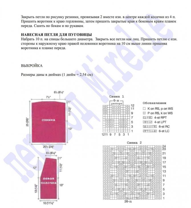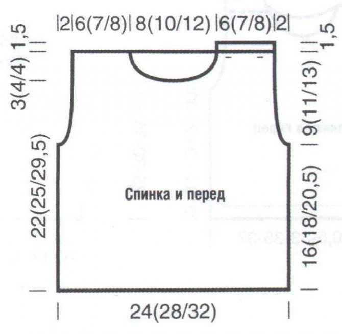 Примечание. Убавления 1 п. для пройм выполнять на расстоянии 4 п. платочной вязки от края в лиц. рядах, провязывая 2 п. вместе изн. п.