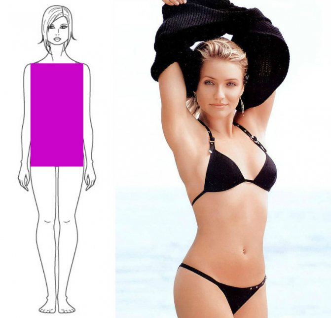 Девушки с фигурой в форме прямоугольника не имеют плавных изгибов, талия у них выражена очень слабо. Грудная клетка достаточно широкая, но бюст, при этом, может быть совсем небольшой. Ножки у обладательниц фигуры прямоугольник стройные.