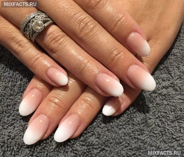 Плавный переход бежевого и розового оттенков в белый смотрится невероятно женственно и утонченно. Покройте ногтевые пластины бондером (специальным клейким веществом). Одну часть покрасьте розовым цветом, а другую бежевым. На краешек ногтя при помощи кисти нанесите белый полуовал. Используя губку, сделайте плавный переход. Подсушите лак под ультрафиолетовой лампой.