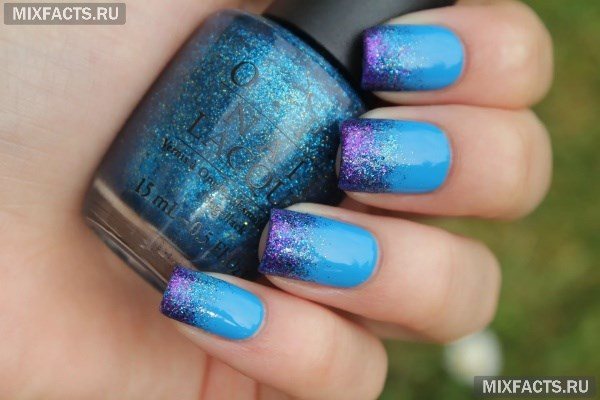 Глиттеры – мелкодисперсные разноцветные блестки, часто применяемые для создания праздничного маникюра. Выберите оттенки на ваше усмотрение. Например, изумрудный и серебристый. Покройте ногти базовой основой, а затем нанесите бондер, не давая ему высохнуть, присыпьте верхнюю часть изумрудом, а нижнюю серебром. Возьмите тонкую кисточку. Аккуратно сместите глиттерные частицы разных цветов, перемешав их между собой на середине. У вас получится необычный блестящий переход.