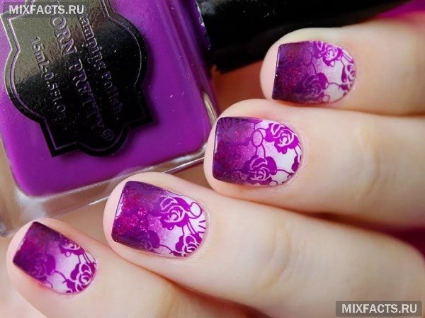 Стемпингом называется искусство нанесения различных узорчатых рисунков на ногтевую пластину. Такой маникюр можно делать как в домашних условиях, так и в салоне (обычно у мастеров уже имеется каталог с многочисленными изображениями). Заранее подберите нужный орнамент. Создайте омбре любого типа: горизонтальный или вертикальный. При помощи тоненькой кисточки и черного гель-лака изобразите необыкновенное тиснение.