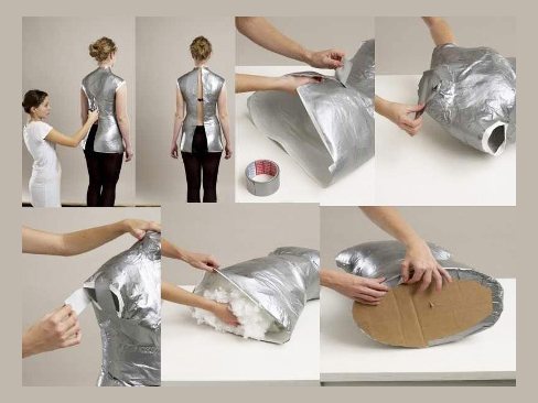 - Оклеивают манекен бумагой в несколько слоев, сверяют полученные размеры с моделью. Устраняют разницу наложением слоя ватина или синтепона (приклеивая их на ПВА).