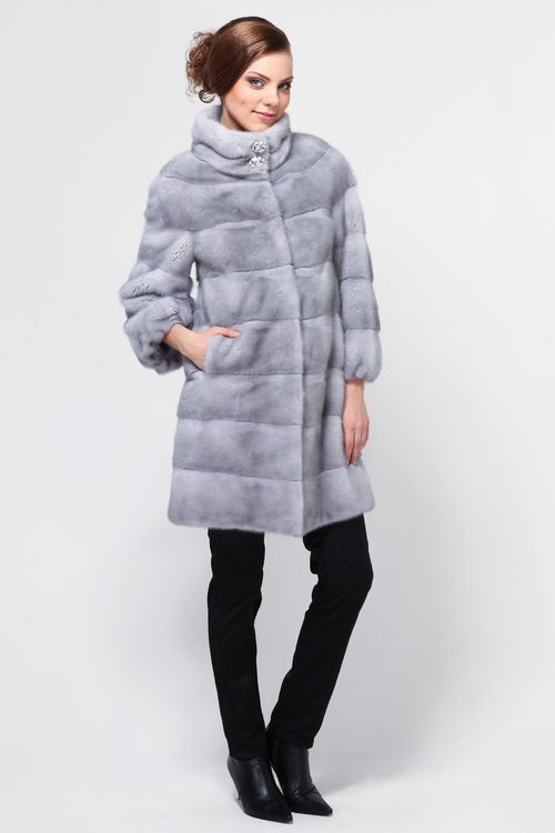 Характерный окрас голубых норок — когда на более светлом фоне выделяются тёмные полоски спины, — великолепно позволяет шить шубы с продольным кроем, как средней длины, так и длинные, в стиле строгого английского пальто или свободного неприталенного, с самыми разнообразными воротниками — с капюшоном и без, с английским воротником, с воротником–стойкой (фото). Этот же характерный окрас очень удачно используется в шубе — поперечке, как на всю длину, так и как вариант частичной поперечки — до пояса, или в виде боковых вставок, или поперечка по низу подола. Здесь также хороши разнообразные фасоны — клеш, прямая и др, с капюшоном типа кобра, с маленьким воротом типа Шанель. А вот фасон автоледи из голубой норки не слишком популярен — в силу того, что мех быстро пачкается.
