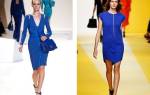 - Цвет горчицы и фиолетовый . Смелое сочетание для одежды, созданной для романтических прогулок, званых ужинов. Платье горчичного цвета с контрастным фиолетовым пояском, воротником и манжетами – удачный выбор настоящей леди.