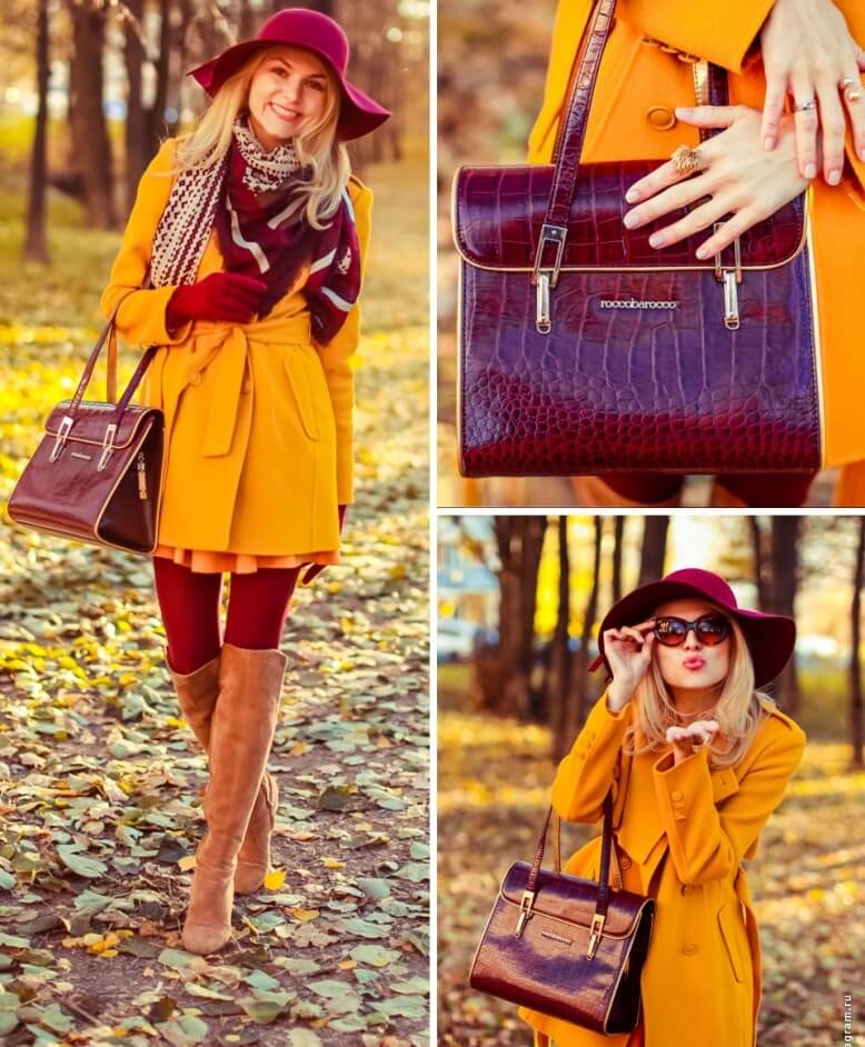 Цвета осени необыкновенно смотрятся в одежде. Выбирайте красный и бордовый из темных тонов, чтобы они не заглушили цвет горчицы. В качестве дополнения отдайте предпочтение аксессуарам в коричневом цвете.