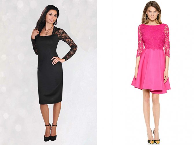 Нередко кружевные рукава переходят в кружевной верх платья. Такое решение особенно рекомендуется для модниц, имеющих телосложение по типу «груша». Оно позволит визуально расширить линию плеч.