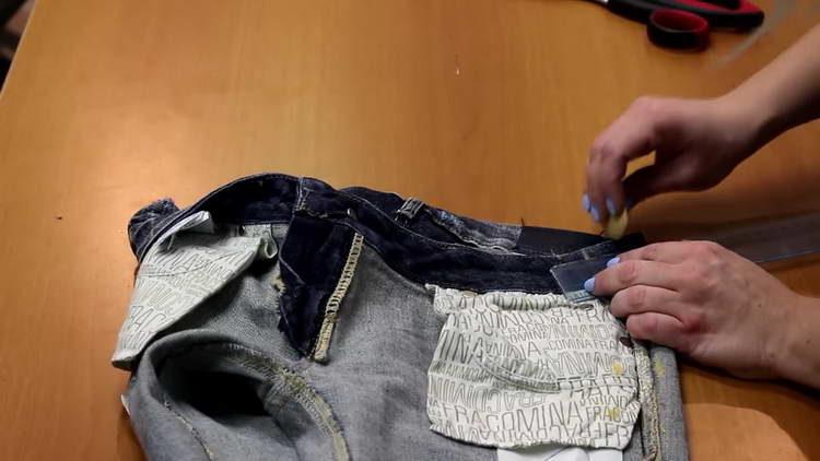 - Сделай отметки на ткани для сужения, нарисуй новые контуры будущих штанин.