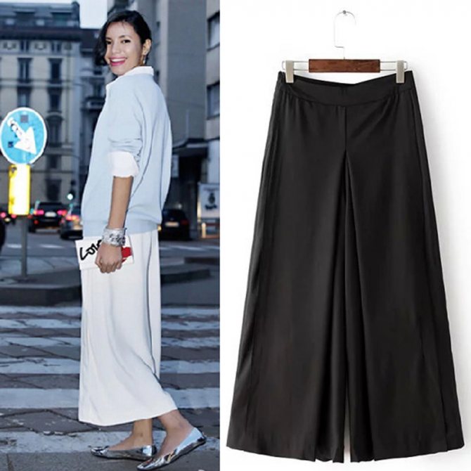 - Кюлоты – широкие брюки, внешне напоминающие юбку миди.