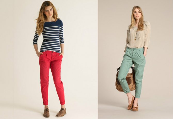 Чтобы брюки выше щиколотки гармонично смотрелись в любом образе, желательно верхнюю часть подбирать в светлых тонах. Это переместит акцент с неудачной нижней части туловища к лицу. Например, к синим брюкам вполне подойдут кофточки голубого, белого или лимонного цвета. Неплохо смотрится и комплект, подобранный в единой цветовой гамме. В такой одежде вы будете выглядеть намного стройнее и элегантнее. С укороченными чиносами прекрасно гармонируют трикотажные изделия ручной вязки, футболки с принтами.