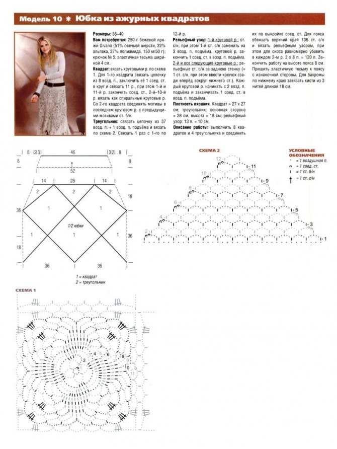 Размер юбки: 46-48. Для вязания юбки вам потребуется: 550 г пряжи (хлопок/вискоза, 400 м х 100 г); крючок № 2. Описание юбки: юбка вяжется по кругу от пояса вниз узором по схеме 12. Для расширения делайте прибавки по