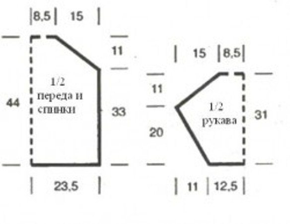 Набрать на спицы 44 п. и вязать следующим образом: 1 кром., 2 п. узор из дырочек, * 6 п. узор « коса», 2 п. узор из дырочек *, повторить 4 раза от * до *, 1 кром. Одновременно с обеих сторон прибавлять в каждом 4-м р. 5 раз 1 п. и в каждом 2-м р. 15 раз 1 п. Прибавленные петли включить в узор из дырочек (= 84 п.). Через 20 см от начала вязания выполнить убавления для формирования скоса реглана так же, как для спинки. Через 31 см от начала работы отложить оставшиеся 30 п. на дополнительную нить. Второй рукав вязать так же, как и первый.