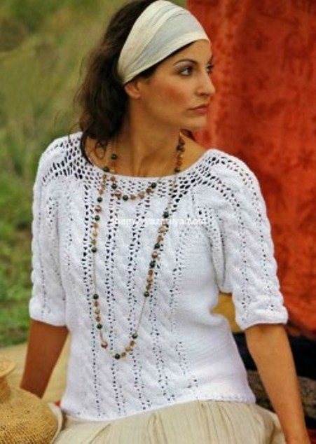 Белоснежный ажурный женский пуловер, выполненный способом «реглан», придаст образу нежности, легкости и нотку романтики.