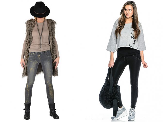 Создать спортивные ансамбли позволяют такие элементы одежды, как майки, топы, комбидрессы, футболки. Рабочий лук включает блузы, рубашки, гольфы, комбинированные с трикотажными кардиганами. Для повседневной носки пригодятся классические джеггинсы, а также туники, свитера в стиле оверсайз и джемпера. Зимой для составления модных луков применяют утепленные лосины на флисе или байке, комбинированные с вязаной туникой, водолазкой и меховым жилетом.
