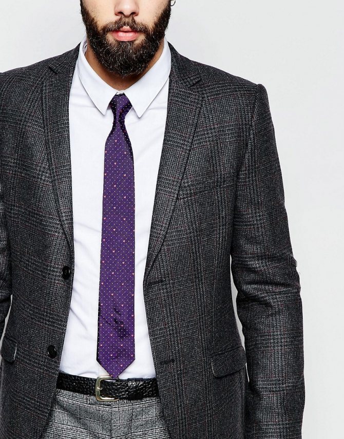 - Фиолетовая подойдет к таким цветам пиджака: черный, серый, синий и голубой.