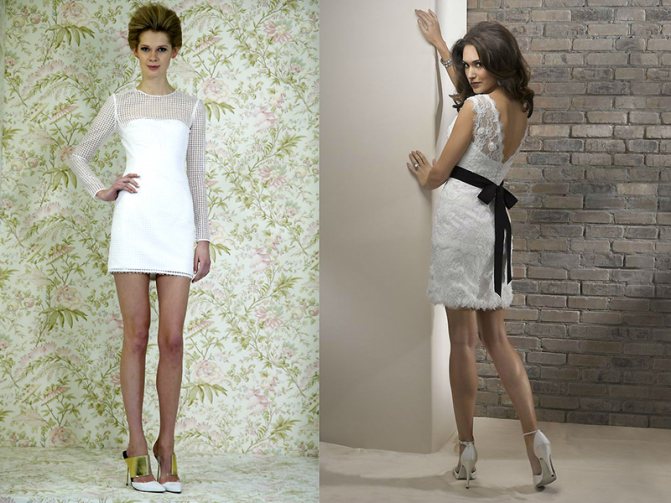 Такие платья выше колена, они подойдут обладательницам стройных ножек. При выборе свадебного мини нужно обратить внимание на его верх, хорошо, если он будет более закрытым, без откровенного декольте, ведь нужно делать акцент на чем-то одном, чтобы не выглядеть неуместно и глупо.