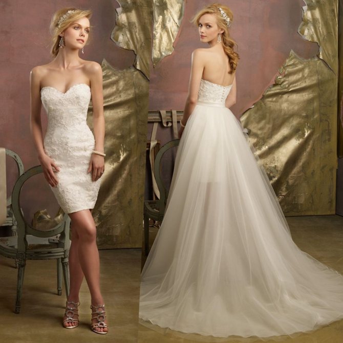 Бывает любой длины и украшается красивыми элементами, например, кружевом. Выбирая данную модель, девушка сможет подчеркнуть свою фигуру, открыть стройные ноги и показать всем свои нарядные свадебные туфли.