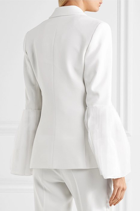 Весьма нарядно выглядит белый брючный костюм делового стиля. Такая модель идеальна для любого торжественного мероприятия.