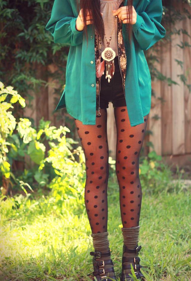 Для более теплой погоды подойдут полупрозрачные черные колготки плотностью 15-20 den. С ними можно надеть классические короткие шорты с необработанным краем, грубые ботинки на шнуровке, вязаные гетры, небрежно спущенные на щиколотки, синюю рубашку и велюровую парку. «Мягким» воплощением стиля гранж в одежде будет тандем рваных шорт с необычной футболкой и кроссовками или ботинками на платформе-танкетке. Стильный образ получается при сочетании полупрозрачных колготок с крупным принтом «горох», джинсовых шорт с отворотами, конверсов и элегантного пальто с шелковым шарфиком. Такой наряд, построенный на контрастах, особенно понравится дерзким девушкам, которые любят эффектные, но удобные наряды с какой-либо «изюминкой».