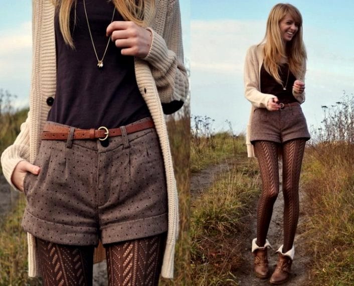Теплые шерстяные шорты идеально сочетаются с плетеными колготами из тонкой пряжи