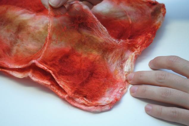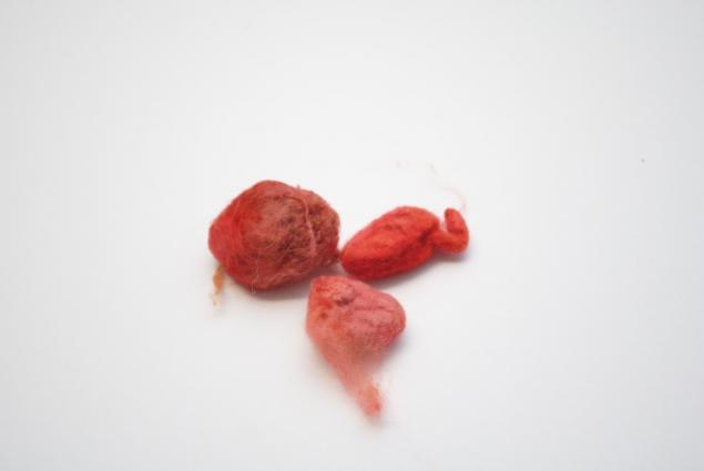 Готовый образец. Мы тестируем каждую новую окрашенную партию волокон. Как вы видите, волокна не окрашивают белую шерсть. Но на белом фоне выглядят менее выйгрышно.