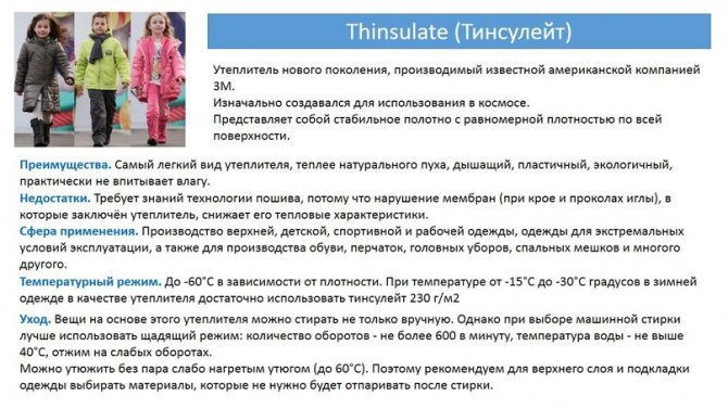Тинсулейт относится к утеплителям нового поколения. По характеристикам похож на искусственный лебяжий пух, но превышает его по показателям сохранения тепла. Материал прочный, не сваливается при носке и стирке, не впитывает запахи и не вызывает аллергии.