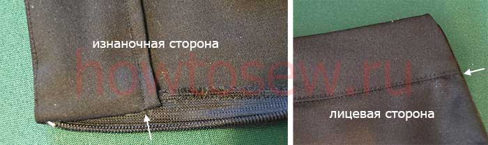 Края застежки заутюжьте по линиям продолжения шва и настрочите на молнию одним из двух способов.