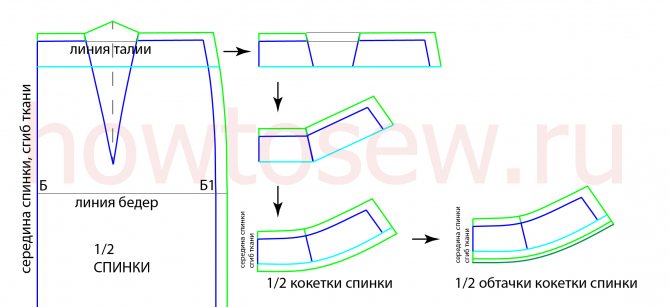 — На выкройке детали спинки юбки с обозначенными припусками (зеленые линии на чертеже), отступив от линии талии на 3,5см отметим низ кокетки (голубая линия на чертеже).
