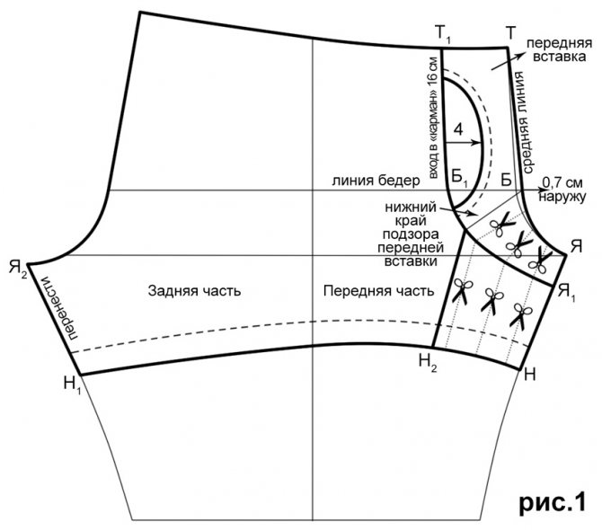 Оформить срез притачивания передней вставки через точки Т1, Б1, Я1.