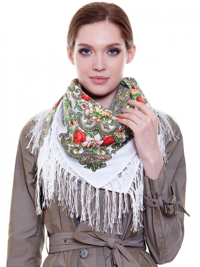 - Павловопосадский платок можно завязать, как обычный шарф, предварительно сложив его по диагонали в несколько раз. При таком способе носки допускается легкая небрежность образа, края и бахрома могут слегка торчать в разные стороны, создавая объемный эффект.