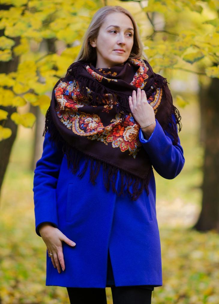 Павлопосадские платки как носить: как арафатку или вообще поверху всей одежды, причем здесь нет значения, будет пальто или жакет.
