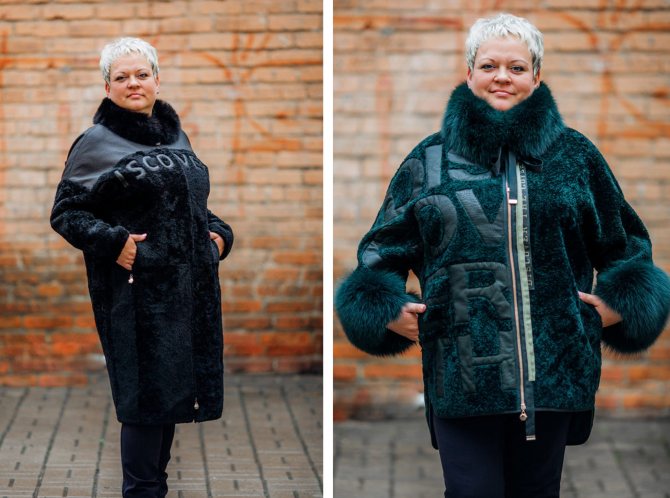 - Теплые дубленки. Дубленка — самая практичная куртка для полной женщины на холодное время года. Основную ценность отыгрывает мех, который не только украшает вещь, но и защищает шею в виде воротника. Подберите фасон таким образом, чтобы убрать внимание с проблемных зон фигуры. И не бойтесь играться с цветами воротника и основы дубленки — так только добавите изюминки.