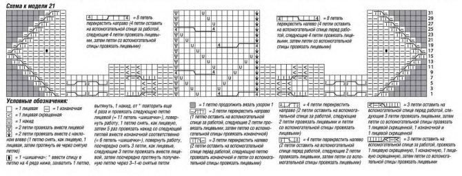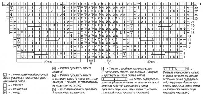 Узор 3: узор косы (на 78 петель) = вязать по схеме. На ней даны лицевые ряды. В изнаночных рядах петли провязывать по рисунку, накиды провязывать изнаночными, лицевые скрещенные провязывать изнаночными скрещенными. Постоянно повторять приведенные в высоту ряды.