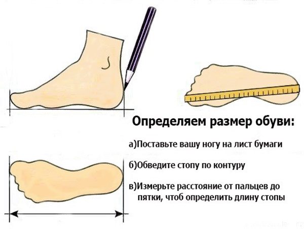 Существует простой способ, как правильно измерить параметры ноги. На листе бумаги следует очертить ступню по контуру. Затем на рисунке нужно отмерить расстояние в сантиметрах от большого пальца (самая длинная точка полученного изображения) до пятки. Обязательно нужно проверить длину обеих ступней, так как результат измерения может немного отличаться. Для определения полноты необходимо замерить ширину ноги в самом широком месте. При выборе модели следует брать за основу больший параметр. Также очень важно обратить внимание на то, что в конце дня ноги у некоторых людей отекают, поэтому размер может немного увеличиться. Зимние модели подбирают с учетом толстого носка.