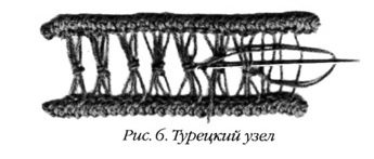 Используется, когда узор образуется с помощью завязывания нескольких нитей различными узлами. Самые распространенные из узелковых – косой тамбурный и турецкий узлы.