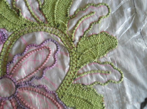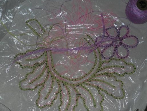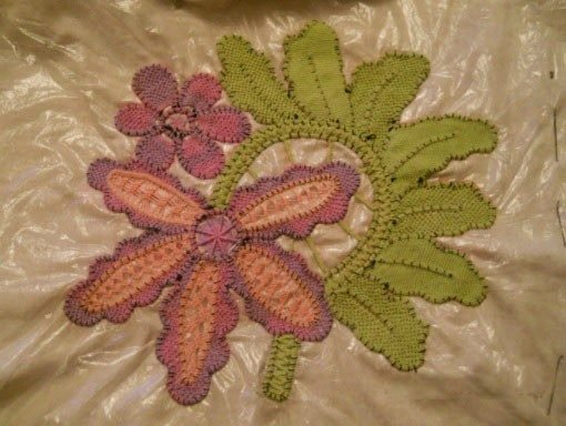 , которое ещё можно сравнить с вышивкой гладью, разноцветными нитями согласно задуманного рисунка. К примеру, можно выложить на ткани салфетку с яркими алыми маками в середине, и потом инкрустировать изделие яркими нитями красного, чёрного и зелёного цветов. В этом случае фантазия не имеет границ, а кружевом из Румынии можно играть, как того пожелает воображение мастерицы.