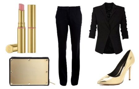 Золотистые туфли под офисный костюм можно выбирать с любым размером каблука. Особенно это касается брючного комплекта: под штаниной низкий каблук будет незаметен, но очень удобен, при этом вы создадите красивый образ. Это идеальное решение для будущих мам, а также тех, кто имеет проблемы с венами. Особенно красиво такие туфельки смотрятся с черными брюками.
