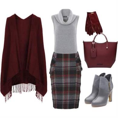 - Девушкам с утонченным телосложением подойдет клетчатая юбка с серым свитером.