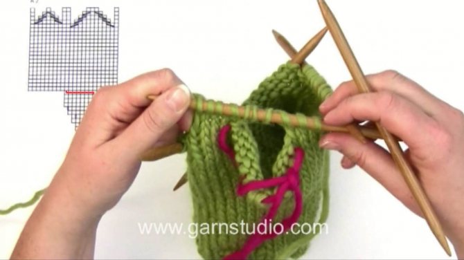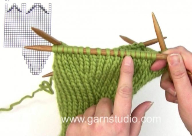Затем, в этом же ряду, в котором мы сняли на булавку петли, набрасываем на спицу столько петель, сколько было у нас в начале клина, сверяясь со схемой.