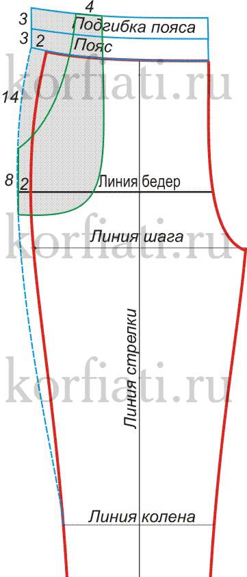 От линии талии вверх отложить по 3см как показано на Выкройке брюк на резинке 1 – пояс брюк. Дополнительно начертить подгибку пояса шириной 3см.