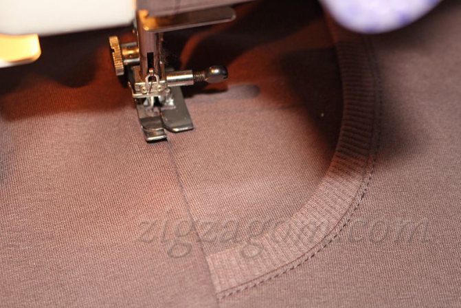 Затем аккуратно пришиваем пояс на оверлоке, равномерно распределяя трикотаж. Удобнее это будет сделать, расположив при пошиве пояс сверху.