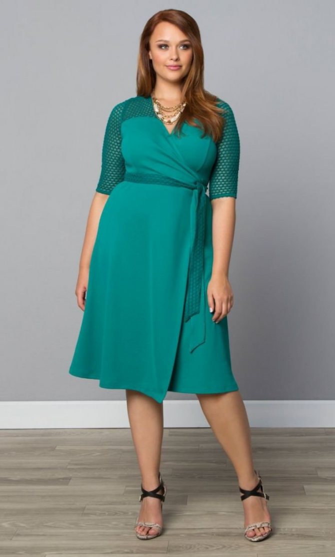 Так как бирюзовый цвет сам по себе не полнит, обратите внимание на ткань платья. Толстый материал и объемный фасон делают фигуру визуально шире