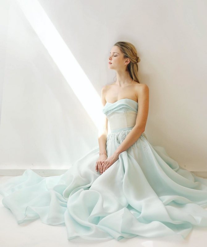 Если копнуть вглубь этимологии, название цвета происходит от слова «бирюза» (от турецкого piruzä, fīrūza, что в переводе «приносящий победу» или же «камень счастья»). Это ценный самоцвет, оттенки которого колеблются от практически белого или небесно-голубого до нежно-зеленого или цвета глубин океана. По аналогии с этим драгоценным минералом окрашивают и ткань для подвенечных нарядов: стартуя от бледных и заканчивая глубокими, непроницаемо-густыми тонами. Те или иные оттенки бирюзы, выбранные для дня бракосочетания (зеленой свадьбы), символизируют готовность новобрачной к приятным переменам в жизни.