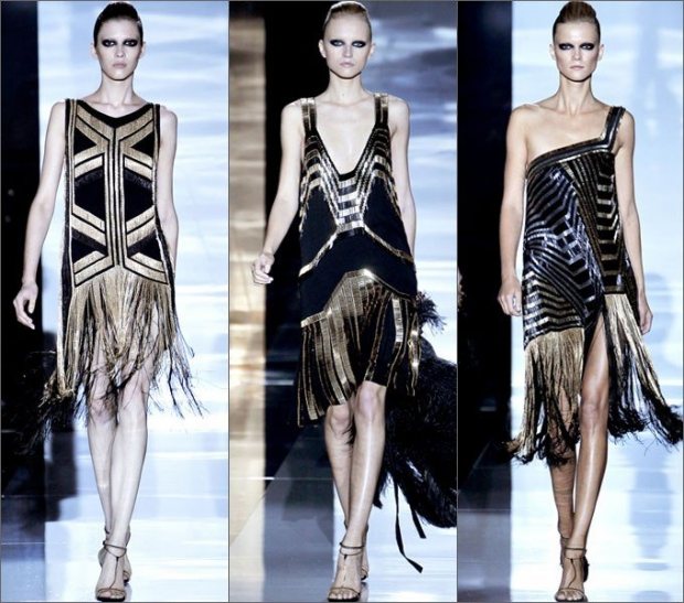 Вечерние платья выполняли из легких струящихся тканей, способных создавать движение. Остромодной была отделка длинной бахромой эффектно «волнующейся» во время танца. Украшениями для вечерних платьев служили перья, блестки, цветы, вышивка.