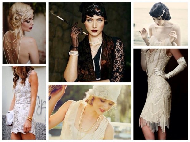 Роскошные платья в стиле ретро выполнены с вырезом на спине и требуют особых украшений. Наряды двадцатых хорошо украсить брошью, парными браслетами, короткими многоярусными колье. Бусы в зоне декольте либо на талии станут отличным завершением целостности ретро образа.